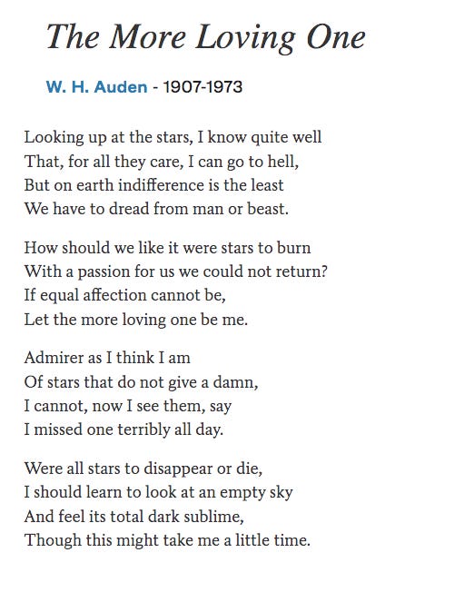 ![POEM] The More Loving One by W. H. Auden : r/Poetry POEM] The More Loving One by W. H. Auden : r/Poetry](https://substackcdn.com/image/fetch/$s_!IUt6!,w_1456,c_limit,f_auto,q_auto:good,fl_progressive:steep/https%3A%2F%2Fsubstack-post-media.s3.amazonaws.com%2Fpublic%2Fimages%2F934894ae-f00c-4263-a062-118af8a79f4e_522x663.png)